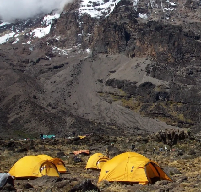 On this and subsequent mornings, wake-up call is at around 6:00 AM. You will be greeted with a steaming cup of tea or coffee, and weather permitting, by a fabulous view of Uhuru peak. Today’s trek takes you up a steep track through a savannah of tall grasses, volcanic rock, and bearded heather. You will encounter giant groundsels as you hike through a ghostly landscape of volcanic lava, caves, and foamy streams. Lunch will be taken just below the Shira Plateau, about three to four hours from Shira Camp. The hike to the next campsite takes approximately six hours and you should arrive between 2:00 PM and 3:00 PM. Most climbers tend to pace themselves, walking slowly and resting about every half-hour. On arrival in camp, there is time to relax and even so for an acclimatization hike with your guides before dinner. Overnight: Shira Camp (FB)