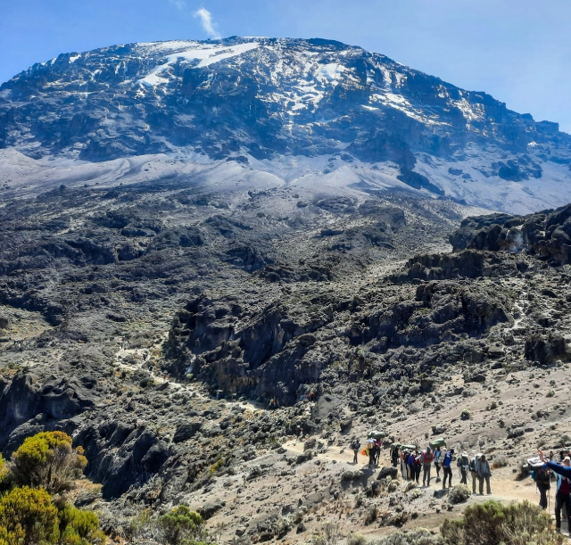 Today’s path takes you up and across a rocky zone where very little vegetation can be found on the inhospitable terrain. A field of sedimentary rocks litter the ground. You leave Karanga and hit the junction which connects with the Mweka Trail. Continue up to the Barafu Camp. At this point, you have completed the South Circuit, which offers views of the summit from many different angles. Amazing views of Kilimanjaro’s two peaks, Mawenzi and Kibo, are to be seen from Barafu Camp. An early dinner will be served in order for you to get the maximum rest before the final ascent starting at around midnight. Dinner and overnight at Barafu Camp (FB)